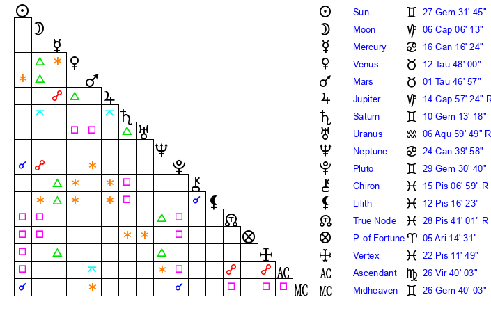 | Moon | 6 Capricorn 1 | 6 Aries 50 | 12 Aquarius 42 |