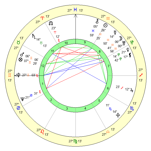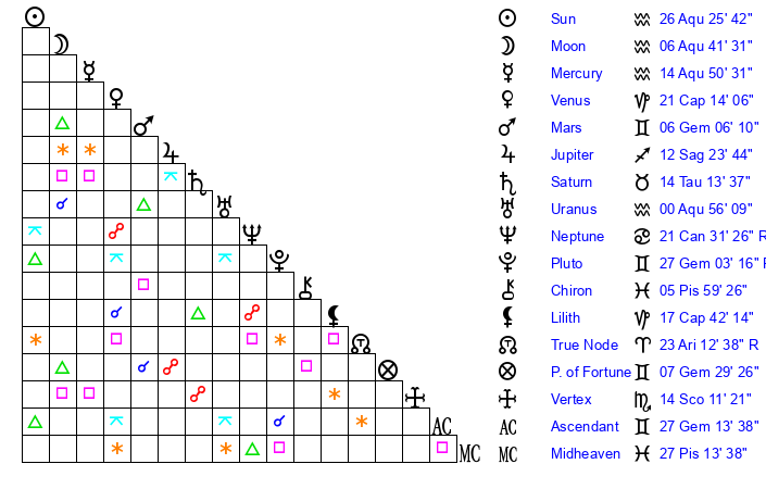 | Sun | 26 Aquarius 25 | 28 Aquarius 1 | 17 Gemini 15 |