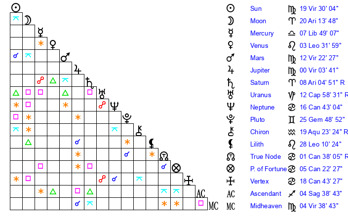 | Sun | 19 Virgo 30 | 20 Virgo 11 | 16 Capricorn 48 |