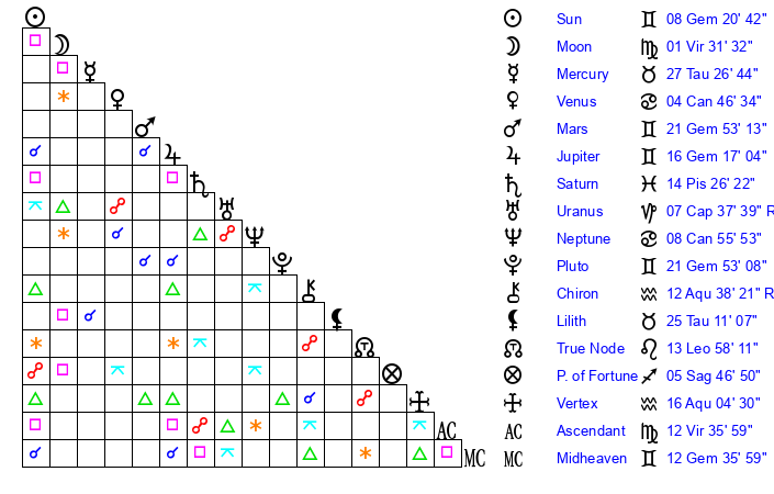 | Pluto | 21 Gemini 54 | 3 Aquarius 39 | 23 Gemini 47 |