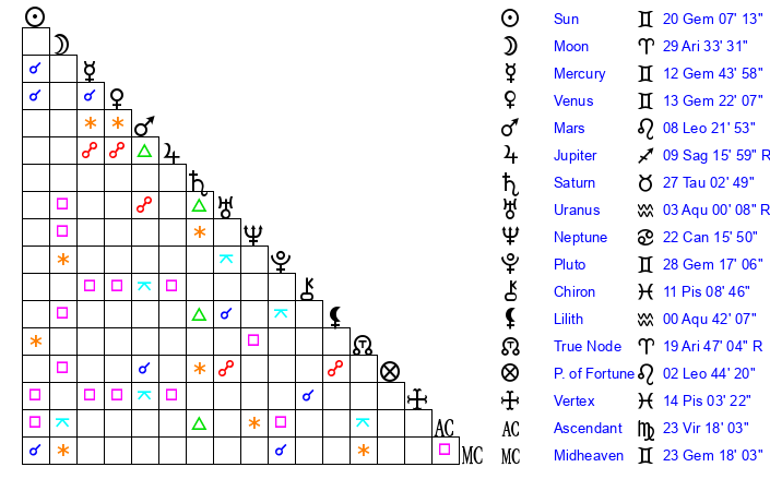 | Moon | 29 Aries 28 | 22 Sagittarius 23 | 20 Gemini 36 |