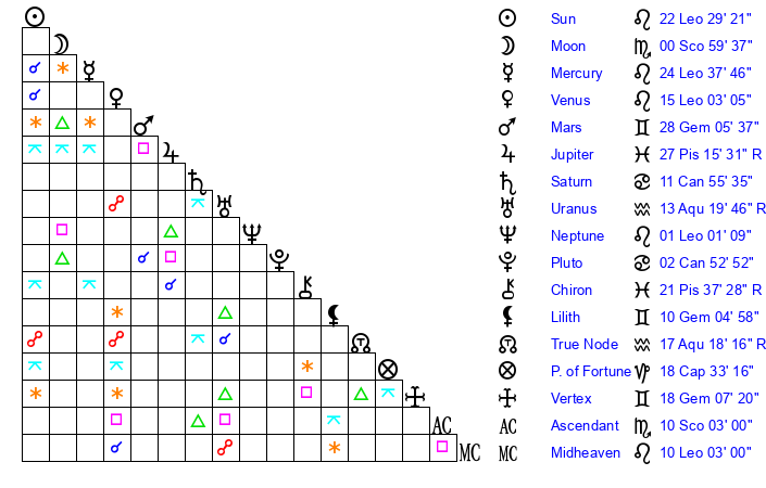 | Neptune | 1 Leo 2 | 1 Aries 42 | 2 Leo 27 |