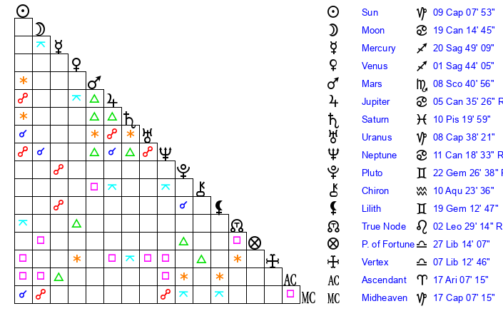 | Moon | 19 Cancer 19 | 19 Capricorn 58 | 13 Scorpio 24 |
