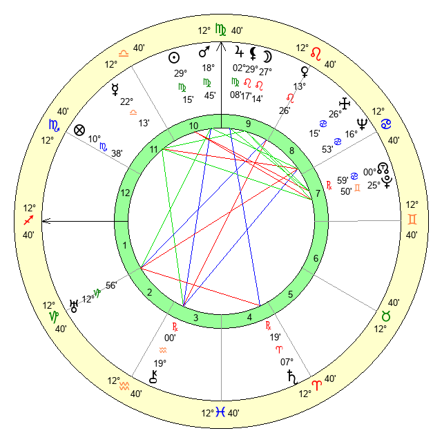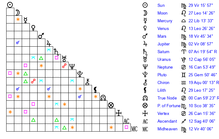 | Sun | 29 Virgo 16 | 29 Virgo 56 | 26 Capricorn 59 |