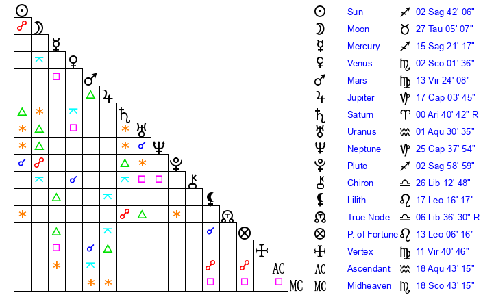 | Moon | 27 Taurus 2 | 21 Virgo 2 | 6 Gemini 10 |