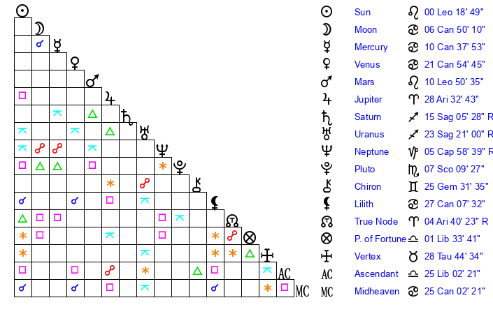| Moon | 6 Cancer 46 | 16 Cancer 48 | 18 Scorpio 33 |