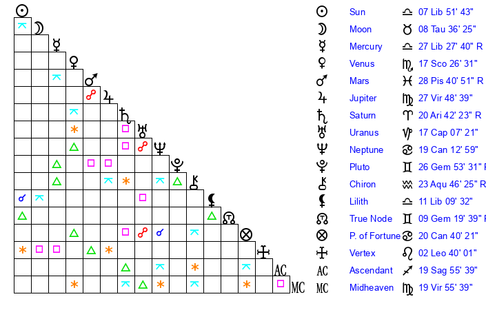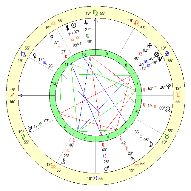 | Venus | 17 Scorpio 27 | 14 Virgo 56 | 0 Pisces 45 |