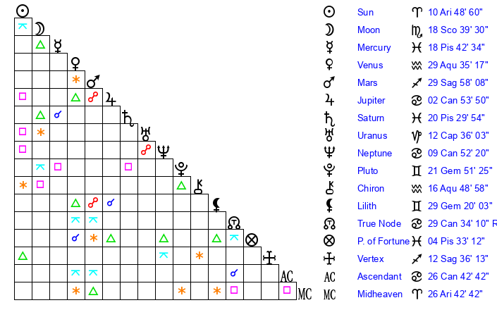 | Sun | 10 Aries 49 | 12 Aries 13 | 4 Leo 27 |