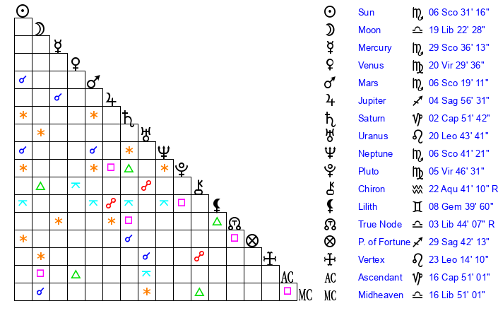 | Sun | 6 Scorpio 31 | 7 Scorpio 31 | 13 Capricorn 21 |