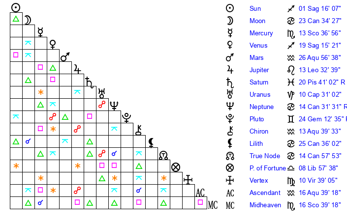 | Neptune | 14 Cancer 32 | 27 Pisces 10 | 12 Cancer 5 |