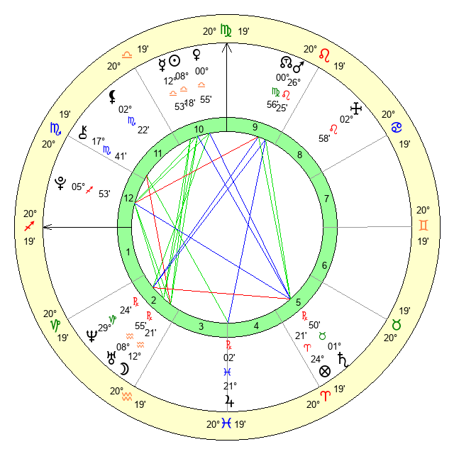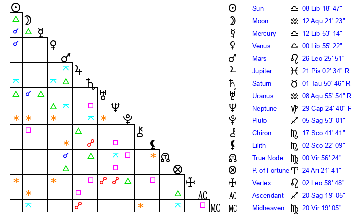 | Venus | 0 Libra 56 | 14 Virgo 56 | 4 Scorpio 42 |