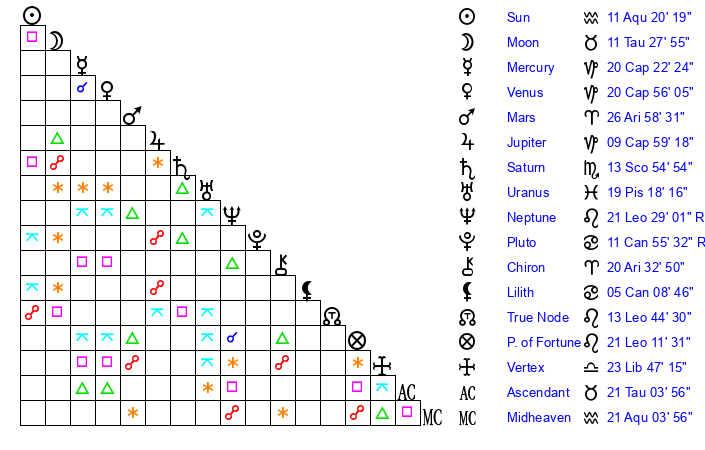 Sun | 11 Aquarius 20 | 12 Aquarius 4 | 20 Taurus 28 |