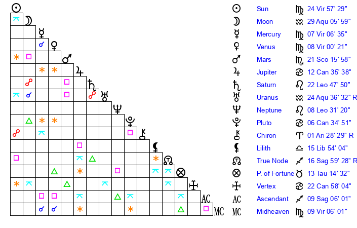 Sun | 24 Virgo 57 | 26 Virgo 2 | 12 Capricorn 17 |