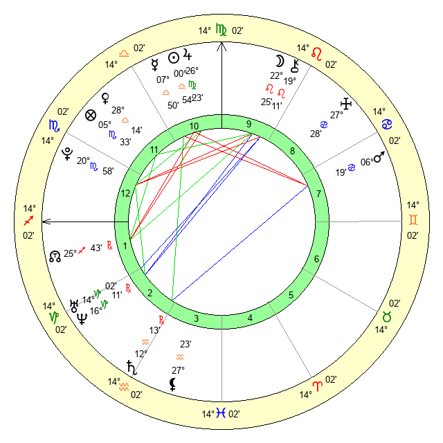 | Moon | 22 Leo 27 | 21 Libra 57 | 14 Scorpio 42 |