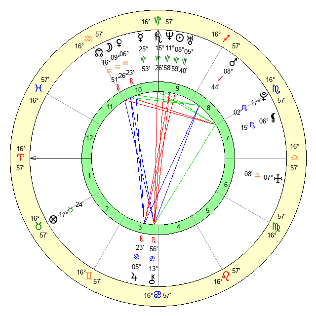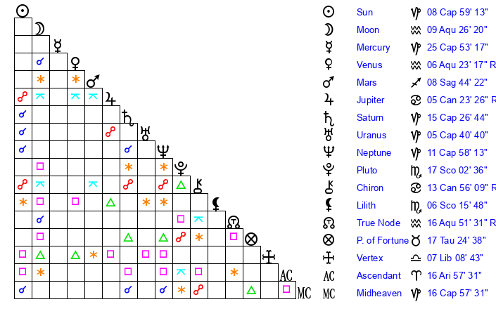 | Moon | 9 Aquarius 28 | 6 Capricorn 43 | 27 Taurus 1 |