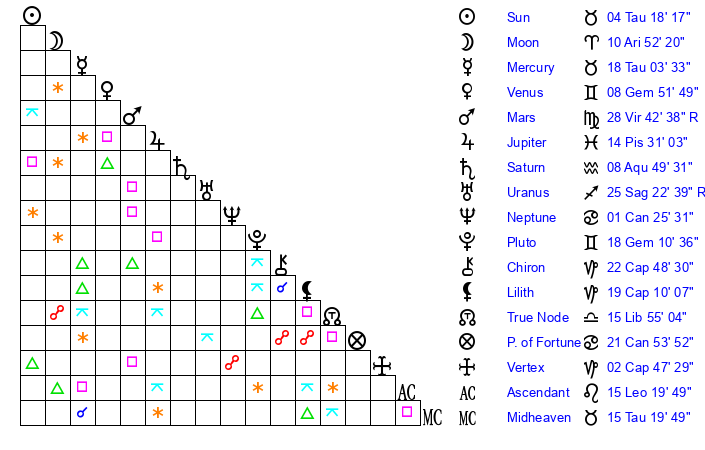 | Mercury | 18 Taurus 4 | 8 Aries 50 | 25 Virgo 17 |