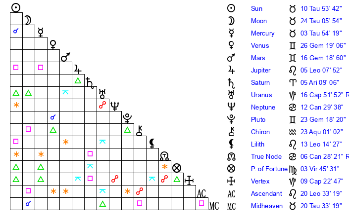 | Mercury | 3 Taurus 55 | 16 Aries 29 | 8 Virgo 56 |