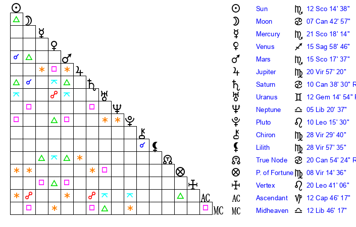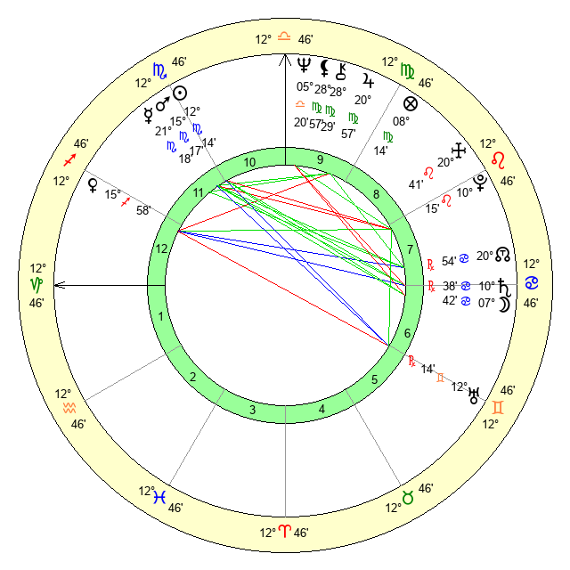 | Neptune | 5 Libra 21 | 27 Pisces 25 | 6 Libra 22 |