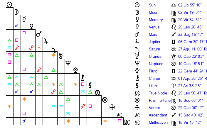 | Moon | 2 Virgo 20 | 27 Scorpio 46 | 3 Aquarius 43 |