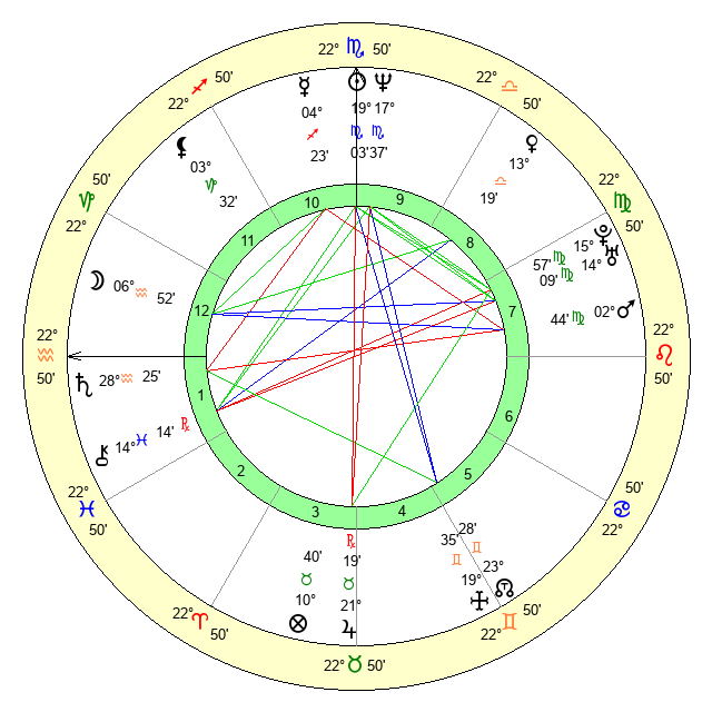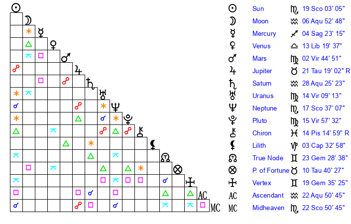 | Moon | 6 Aquarius 52 | 9 Leo 14 | 27 Aries 43 |