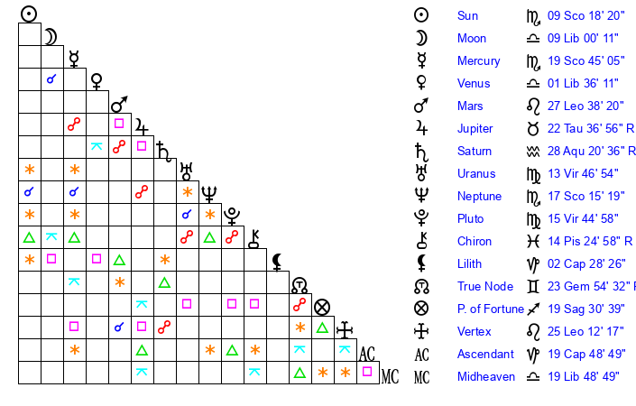 | Moon | 8 Libra 54 | 16 Pisces 41 | 28 Sagittarius 25 |