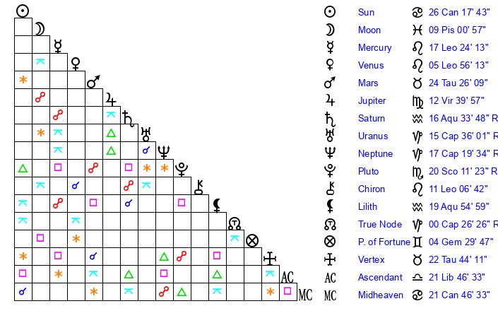 | Mercury | 17 Leo 24 | 15 Leo 33 | 9 Leo 26 |