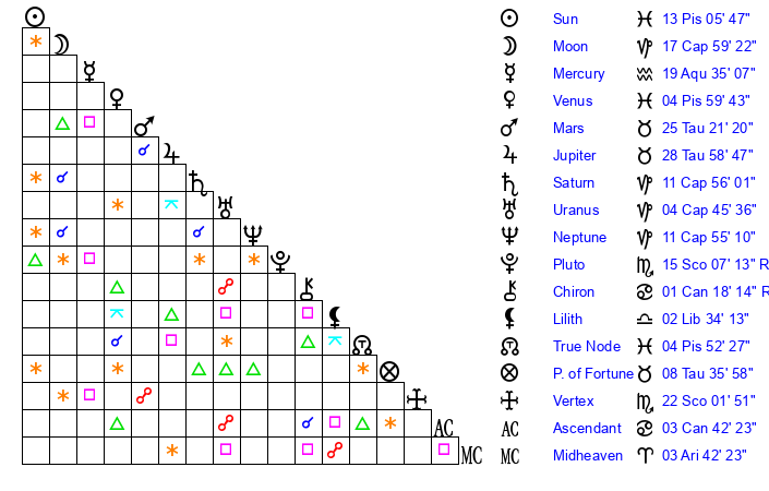 | Moon | 17 Capricorn 58 | 3 Taurus 48 | 24 Taurus 50 |