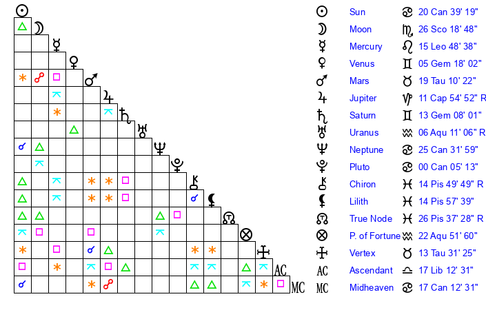 | Sun | 20 Cancer 39 | 21 Cancer 33 | 9 Scorpio 40 |
