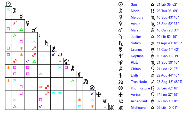 | Sun | 21 Libra 36 | 21 Libra 36 | 24 Scorpio 35 |