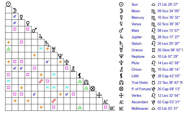 | Neptune | 10 Libra 58 | 0 Aries 9 | 12 Libra 56 |
