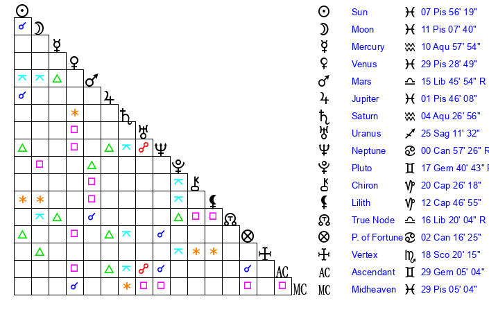 | Sun | 7 Pisces 56 | 9 Pisces 21 | 6 Cancer 45 |