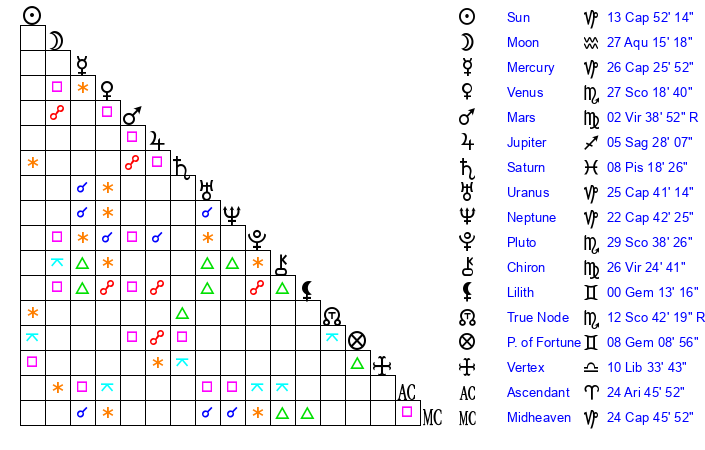 | Uranus | 25 Capricorn 43 | 23 Taurus 34 | 27 Capricorn 28 |