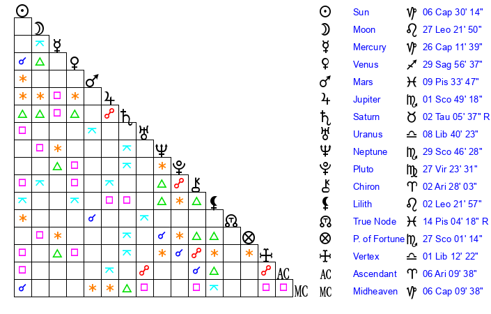 | Pluto | 27 Virgo 23 | 0 Aquarius 57 | 26 Virgo 40 |