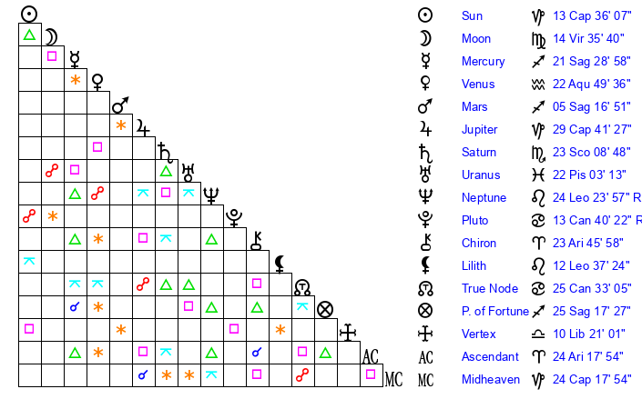 | Sun | 13 Capricorn 36 | 14 Capricorn 35 | 23 Aries 0 |