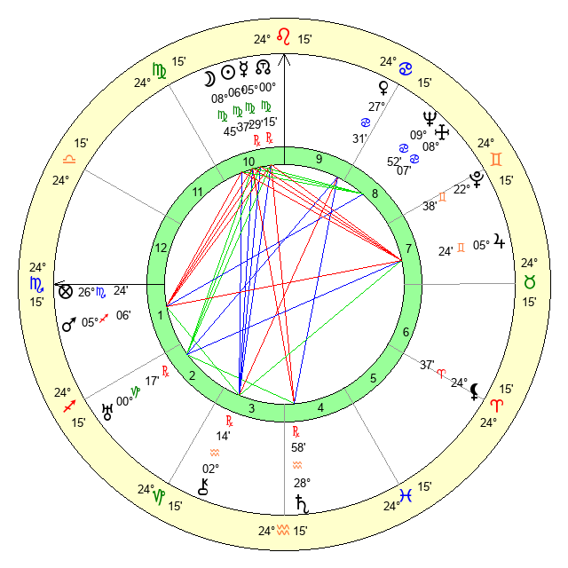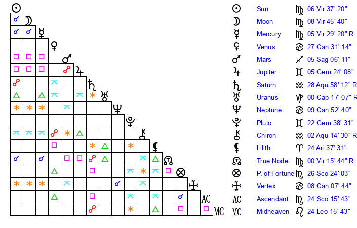| Moon | 8 Virgo 44 | 1 Sagittarius 28 | 9 Aquarius 21 |