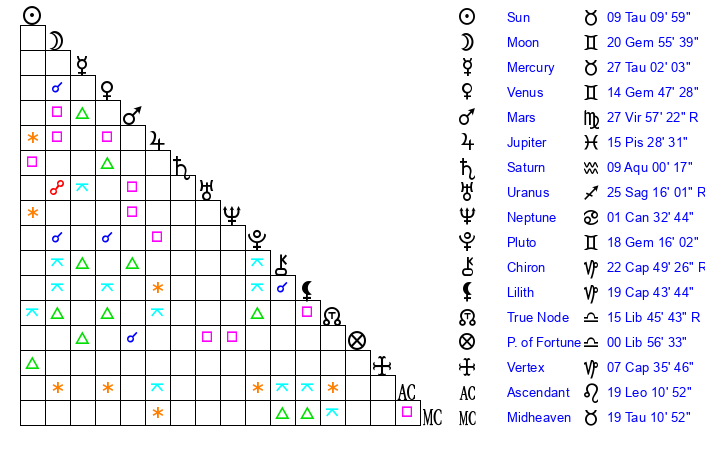 | Pluto | 18 Gemini 17 | 3 Aquarius 48 | 20 Gemini 38 |