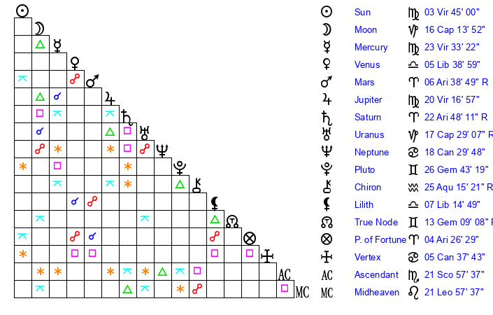 | Moon | 16 Capricorn 13 | 25 Libra 50 | 20 Aries 36 |