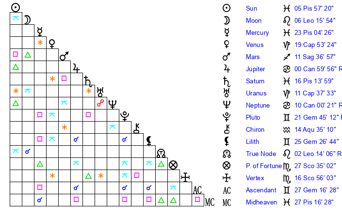 | Sun | 5 Pisces 57 | 7 Pisces 20 | 1 Cancer 3 |