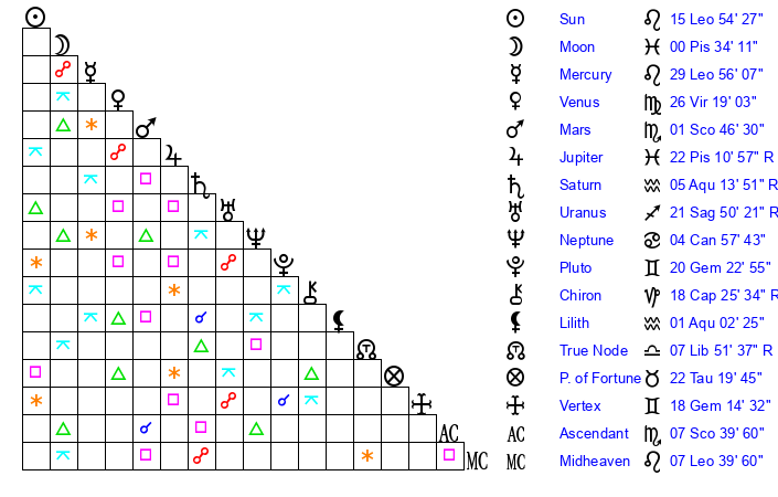 | Sun | 15 Leo 54 | 17 Leo 21 | 16 Sagittarius 27 |