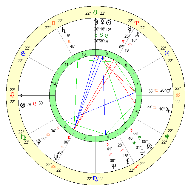 | Moon | 20 Taurus 24 | 29 Cancer 17 | 9 Aries 55 |