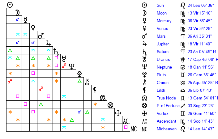 | Moon | 13 Virgo 15 | 14 Gemini 37 | 6 Sagittarius 13 |