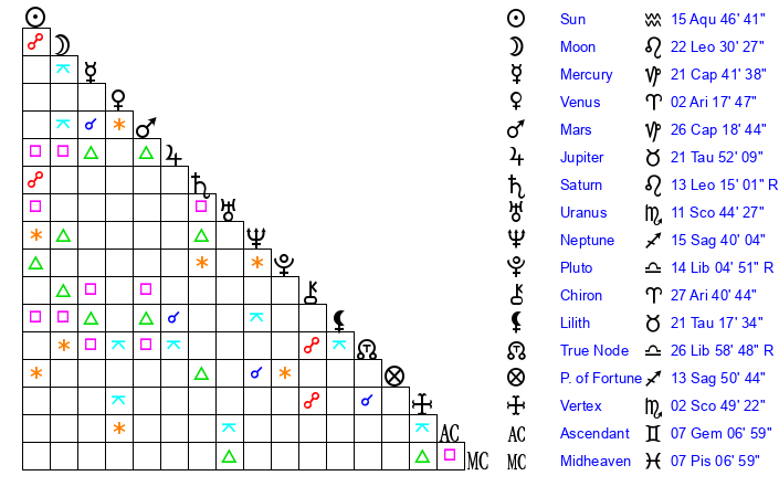 | Saturn | 13 Leo 40 | 17 Pisces 46 | 10 Leo 38 |