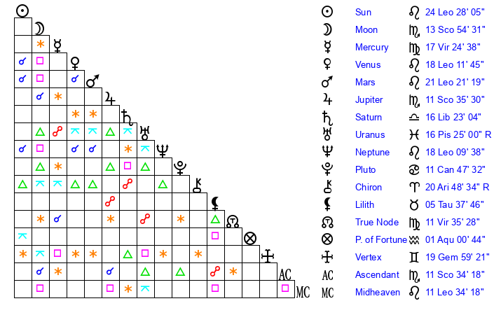 Sun | 24 Leo 28 | 25 Leo 46 | 5 Sagittarius 11 |
