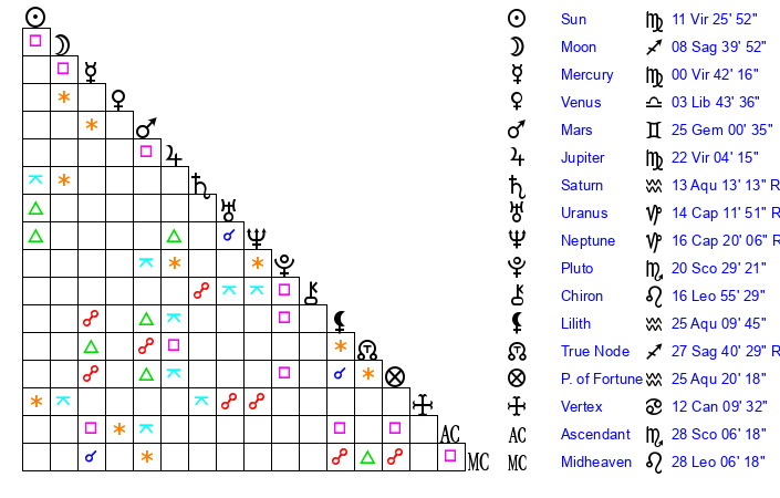 | Saturn | 13 Aquarius 11 | 29 Pisces 42 | 11 Aquarius 52 |