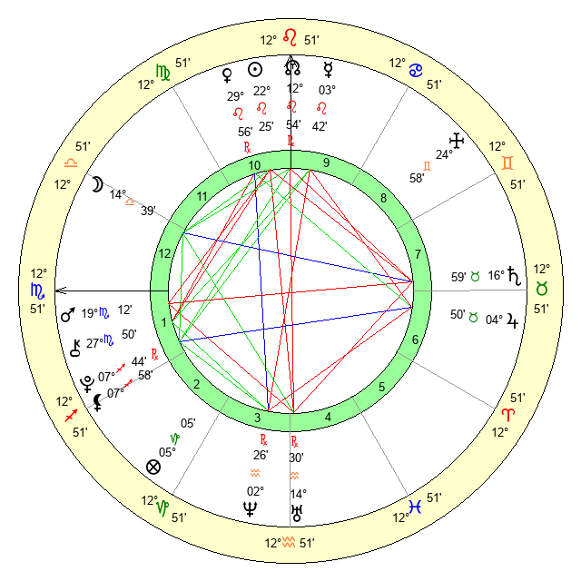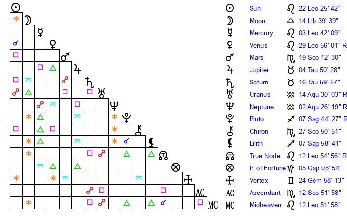 | Moon | 14 Libra 47 | 16 Taurus 15 | 27 Virgo 4 |