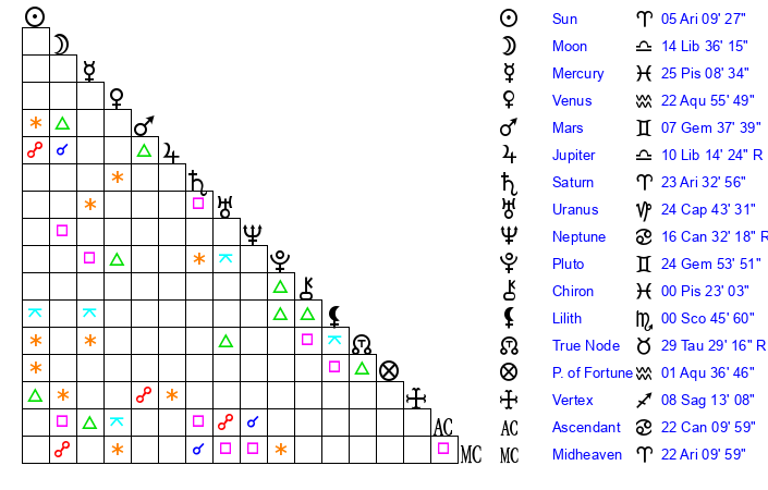 | Sun | 5 Aries 10 | 6 Aries 17 | 26 Cancer 7 |