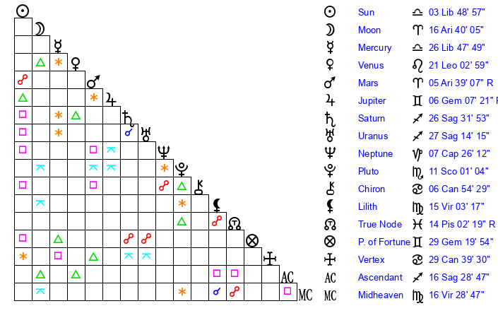 | Mars | 5 Aries 40 | 2 Scorpio 57 | 0 Aries 5 |