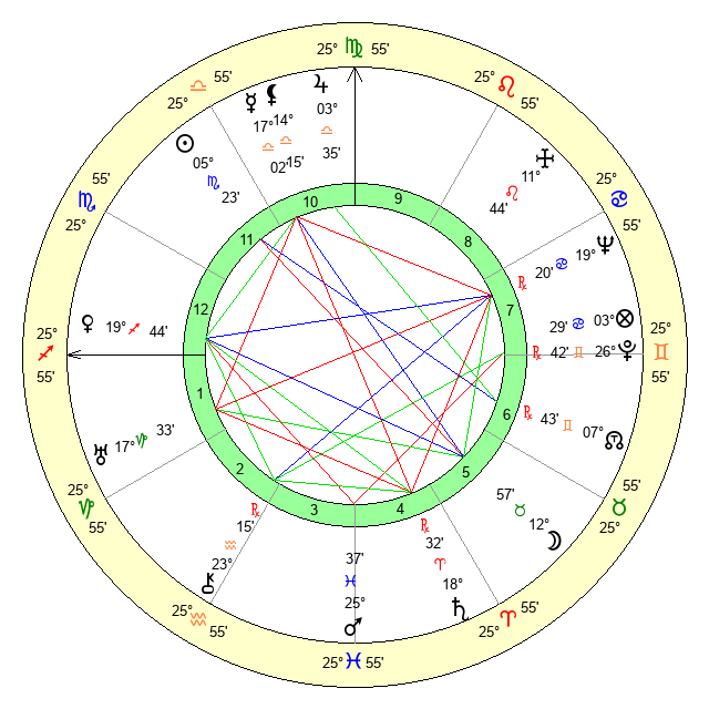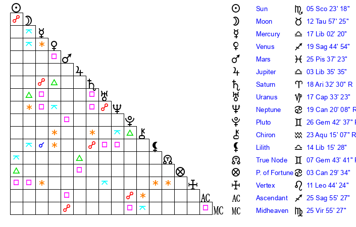 | Mars | 25 Pisces 38 | 25 Scorpio 40 | 17 Taurus 55 |