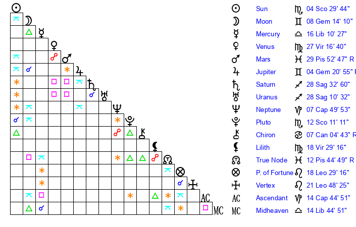 | Moon | 8 Gemini 14 | 12 Capricorn 8 | 7 Libra 54 |