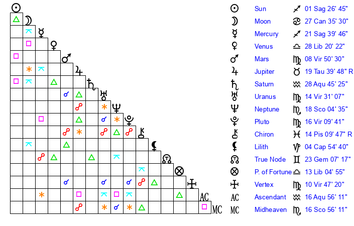 | Sun | 1 Sagittarius 27 | 1 Sagittarius 54 | 2 Aquarius 29 |